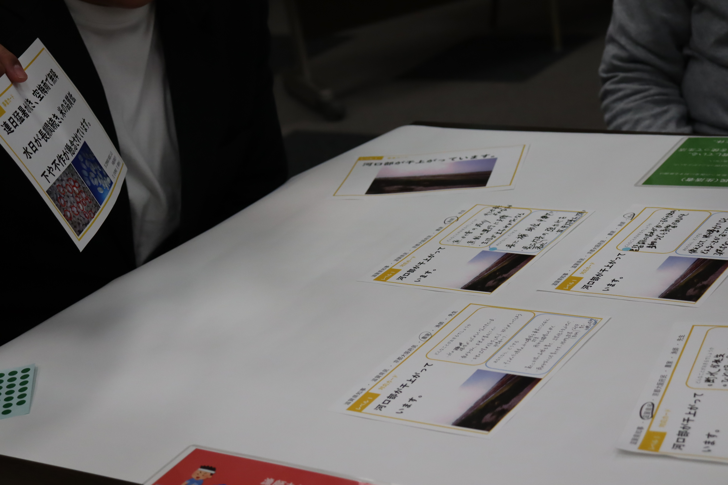 3)5分経ったらもしくは事象カードがなくなったら、対応カードに「どんなんことが起きるでしょうか」「あなたならどうする?」に各々記入する(約7分)