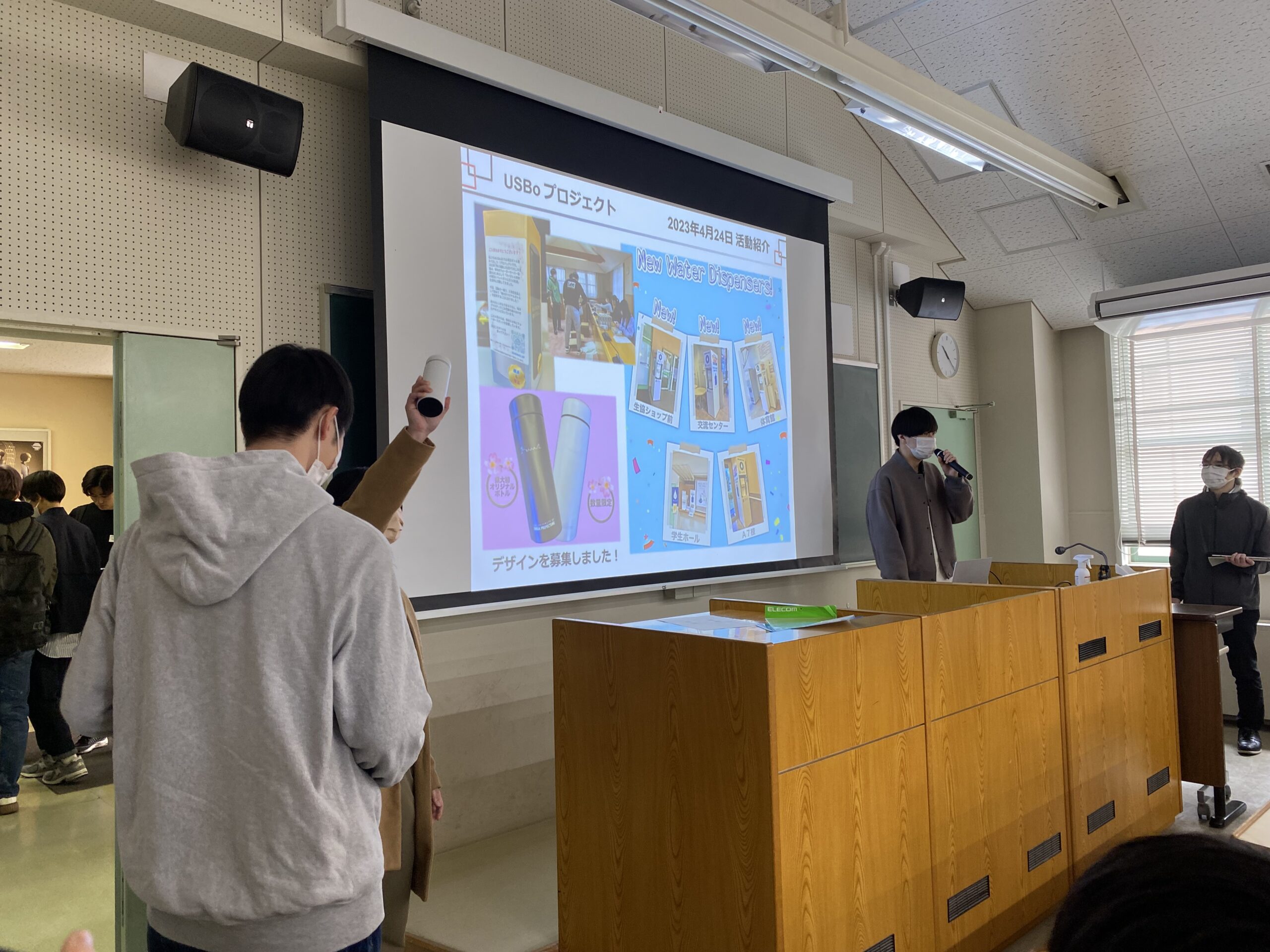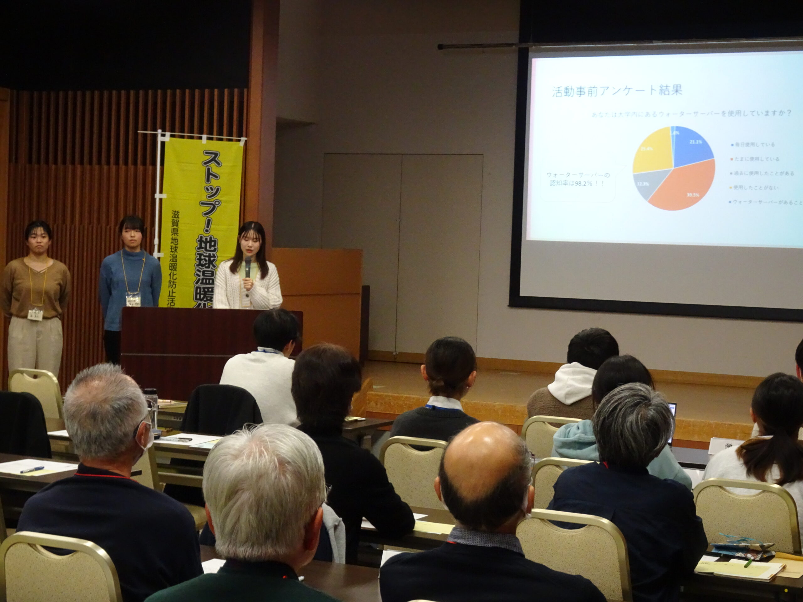 マイボトル持参率向上の取り組みでは、学内でアンケートを実施しマイボトル持参率調査を行いました。結果、滋賀県立大学では毎日、ほぼ毎日マイボトルを持参している学生が6~7割。半々の学生を含めると約8割となり、マイボトルを持って大学へ行くことが脱炭素につながる新しいキャンパスライフ(=新しい生活スタイル)になっています。2年前と比べると、変化は歴然。大学生活において、マイボトルが欠かせないものになっています。