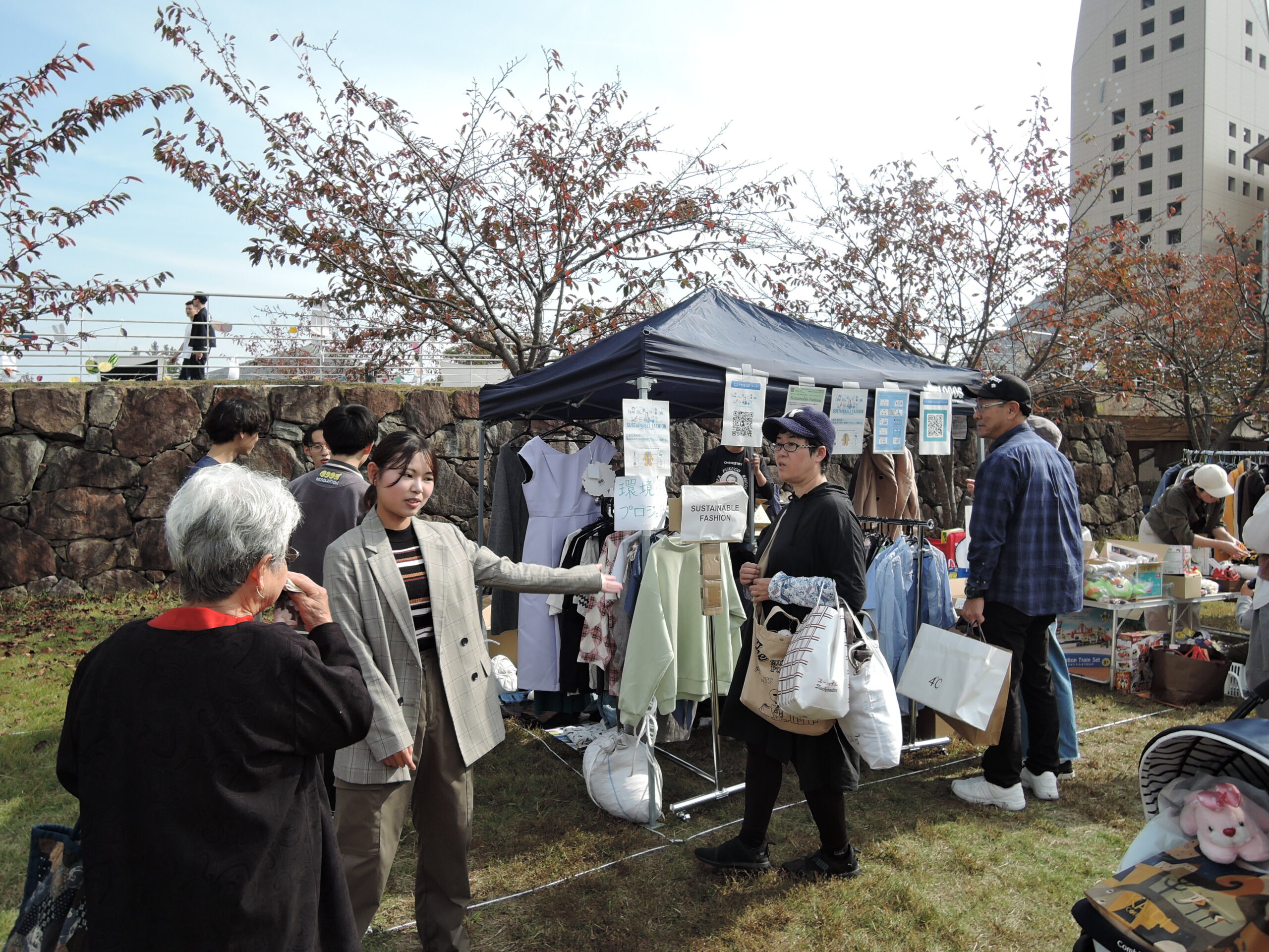 サステナブルファッションは、今年度初めての取り組みです。大学生に服は環境負荷が大きいことを知ってもらうと共に、少しでも環境負荷を低減するために学内で服を回収し、学祭でフリーマーケットを行いました。売れた衣類の重さを測定しCO2排出量を算出しました。